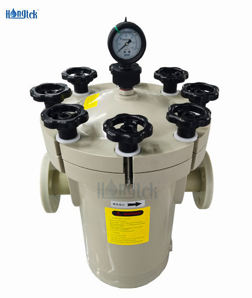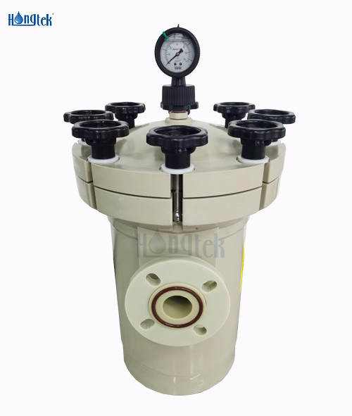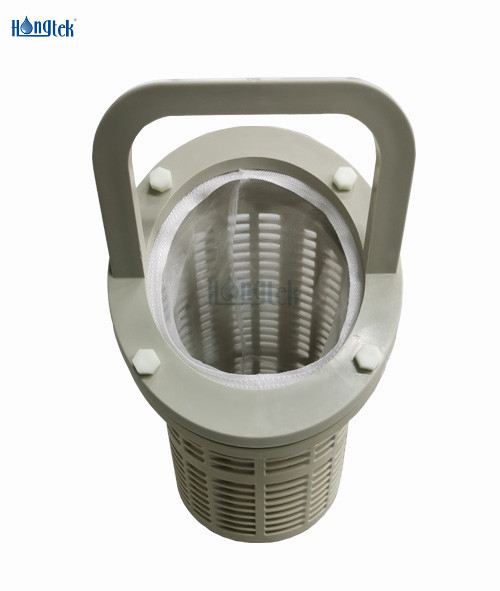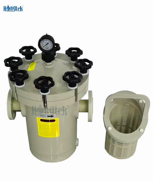 La carcasa de la bolsa de filtro de filtro de cesta industrial de plástico PP reforzado con PPH de la serie PBS está construida con material de polipropileno reforzado con homopolímero de polipropileno (PPH), que es moldeado por inyección de una sola pieza, sin costuras, sin callejones sin salida, fácil de limpiar, buen sellado con un diseño estricto a prueba de fugas. El filtro de cesta industrial de plástico PPH está disponible en bridas de diferentes tamaños DN32, DN40, DN50, DN65, DN80, DN100 para cumplir con los diversos requisitos de capacidad de flujo del cliente. La canasta interior perforada con bolsa de filtro atrapa el material no deseado y permite que el medio de proceso fluya libremente. Además, cambiar la bolsa filtrante o limpiar el cesto colador de plástico es muy rápido y sencillo. Con ventajas de resistencia a altas temperaturas y altas presiones, resistencia a ácidos y álcalis. El colador de cesta de plástico industrial Hongtek PPH es ideal para proteger bombas, válvulas, filtros, boquillas u otros dispositivos de control de líquidos en sistemas de fluidos corrosivos o no corrosivos.