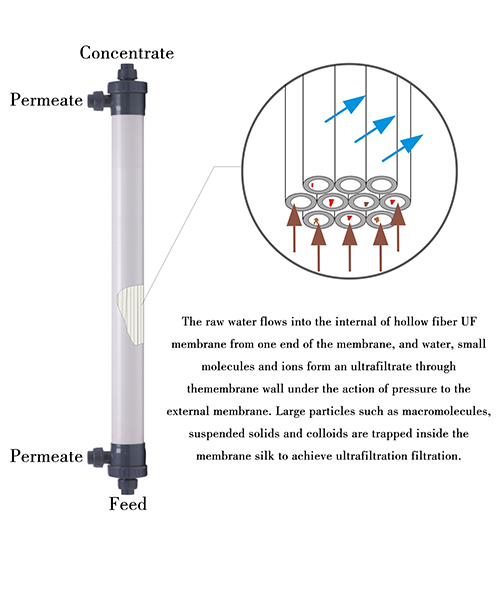 ● El modo de flujo de agua de la membrana de ultrafiltración de fibra hueca de PVC es de adentro hacia afuera