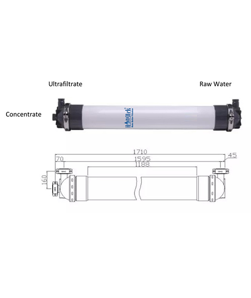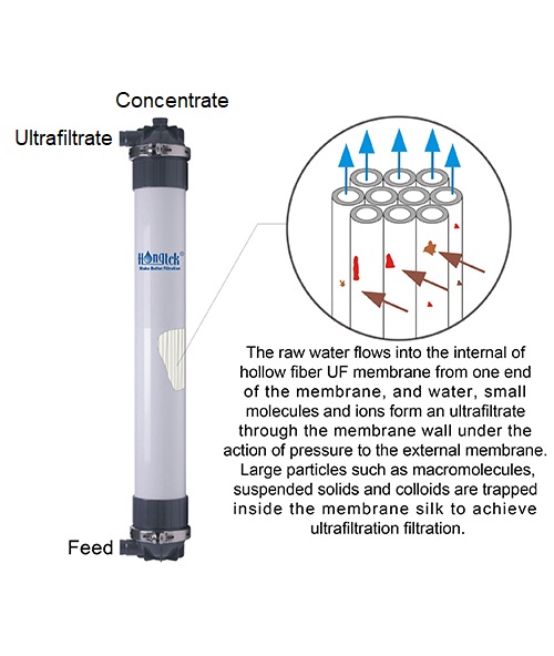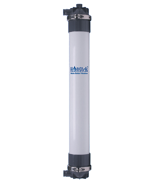 El módulo de membrana de ultrafiltración de PVDF de 8" de la serie Hongtek UFM200 está hecho de un material de membrana de PVDF (fluoruro de polivinilideno) anticontaminación de alta calidad, con alta estabilidad química, resistencia a la oxidación y resistencia a ácidos y álcalis. La membrana de ultrafiltración de PVDF es permanentemente hidrófila para un alto rendimiento. La distribución del tamaño de los poros de la fibra de la membrana UF de fibra hueca de PVDF es uniforme, lo que garantiza una buena calidad del agua estable. La membrana de ultrafiltración de fibra hueca de PVDF tiene buena resistencia mecánica, área de filtración de superficie más grande, fácil de retrolavado, por lo que el módulo de membrana de PVDF tiene una larga vida útil.
